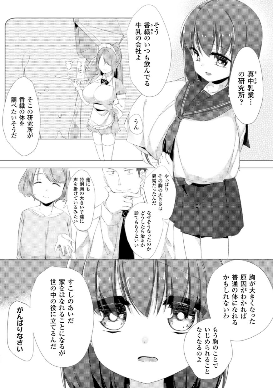 爆乳で悩んでいた少女「かおり」が、最終的に母乳を噴きだす超乳にされてしまうお話。